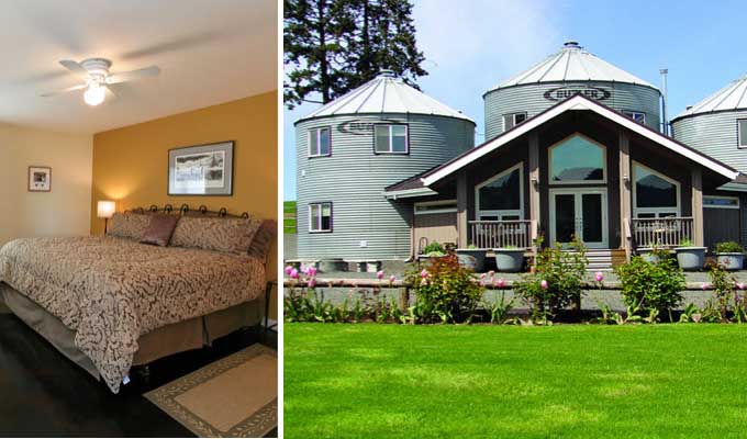 Set inside three converted grain silos, this rustic bed & breakfast and event center offers guesthouses overlooking a vista of vineyards and farmland. Each of the five quaint, individually-styled rooms come decorated with floral fabrics and wicker furnishings. Breakfast is served indoors or on a shaded patio, and guests can enjoy a tour of the working farm. Take a short drive to almost a dozen nearby wineries or spend the afternoon touring the owner’s flower and vegetable gardens.